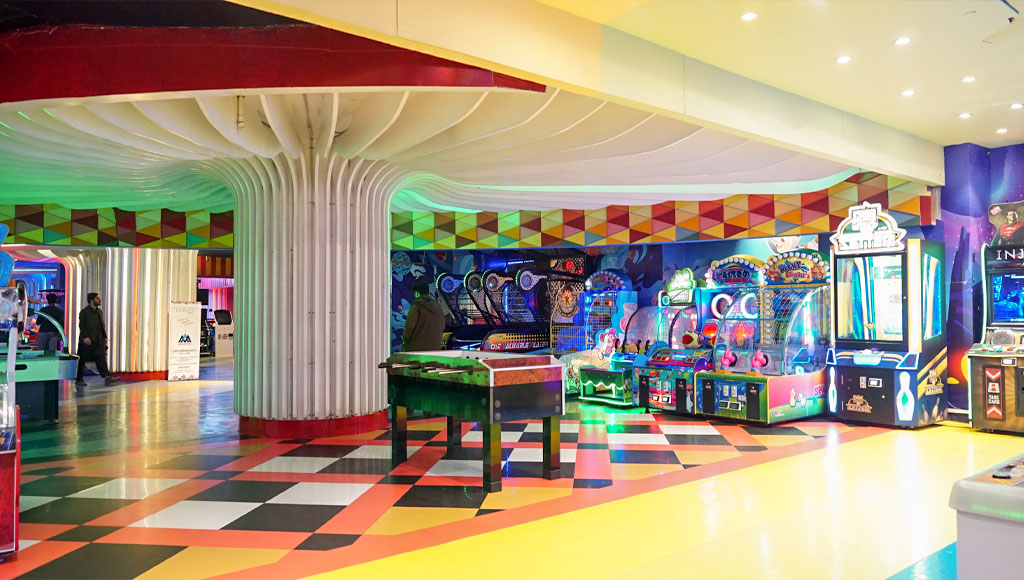 A large indoor amusement/entertainment zone with arcade games, trampoline park, rides, VR experiences, soft play, interactive puzzles, and mini‑rides for kids of all ages.