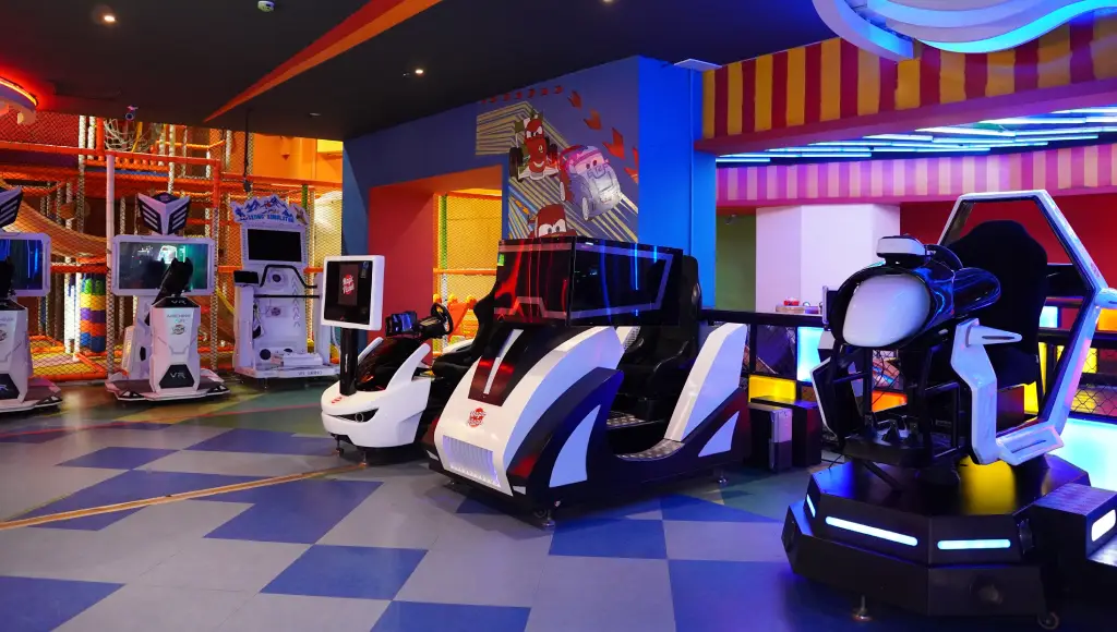 These include a trampoline park, soft play area, mini‑rides, VR games, roller skating, bumper cars, interactive/puzzle games, and arcade redemption machines.